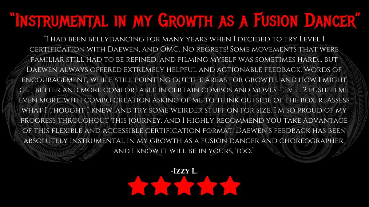 This certification teaches intermediate-level fusion belly dance techniques, including layering, complex combinations, and choreography creation.